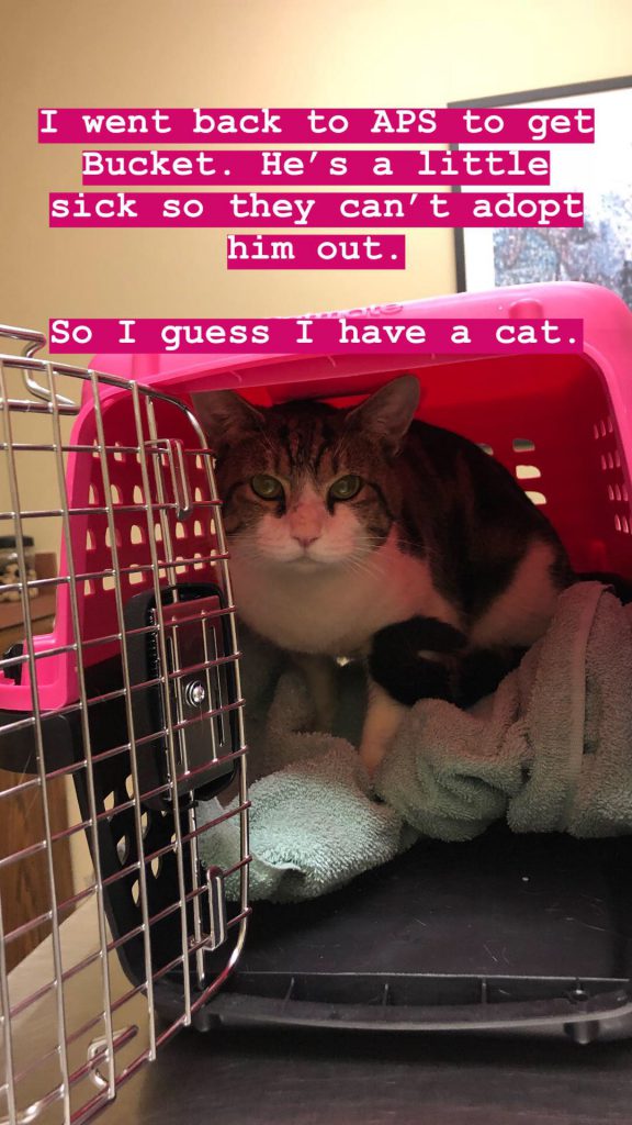 Yesterday, I picked up a cat from the Durham shelter! I had found him a few weeks ago hanging around my apartment and brought him to the shelter. I left him there with instructions for them to call me if they couldn’t adopt him out. So they called me and said he had conjunctivitis and diarrhea so they couldn’t keep him. I got him yesterday and brought him straight to the vet. (He’s fine. The vet thinks he’ll recover on his own without any drugs even.) Tom will take care of him while I’m gone. He is probably still hiding somewhere in Tom’s house right now. He didn’t want to come out much last night, but he did use the litter box. Hopefully, he’ll be a good kitty. I didn’t really want a cat, but I think I have one now!