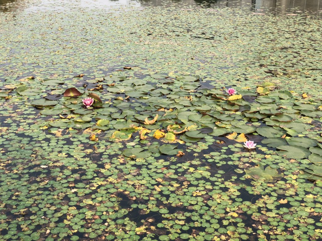 If you look closer, you’ll see some fairly large fish swimming around among the thick water plants under the surface.