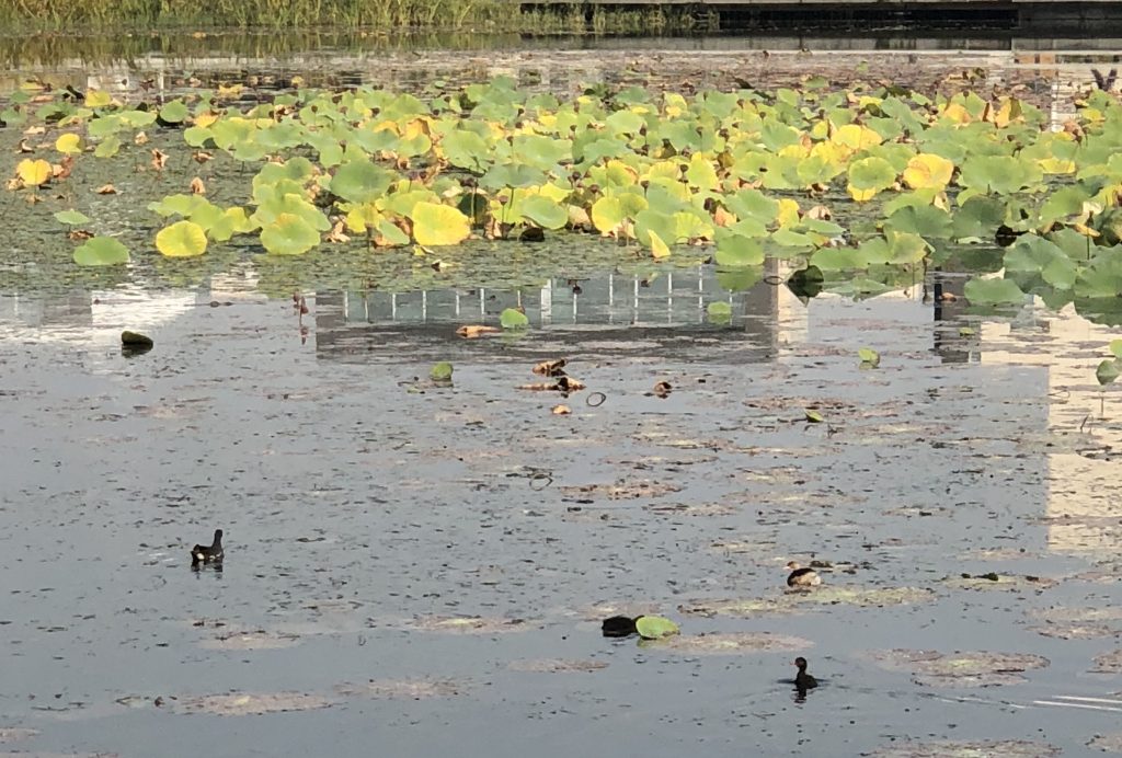 A family of tiny black ducks lives on the lake, too. The babies are still small and fuzzy, and when they get tired of swimming, they scurry across the lily pads. It’s adorable, but they’re always too far away for me to get a video.